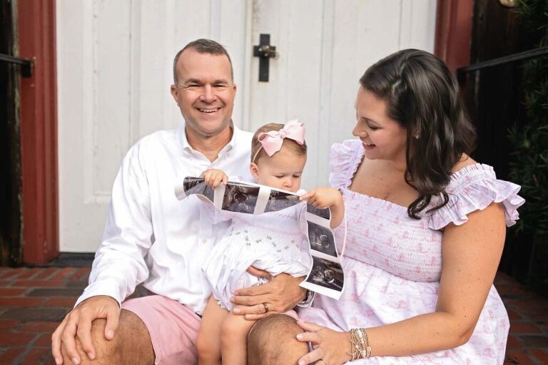 Nothing makes my heart happier than watching a family grow — and this sweet family of three is excitedly preparing to welcome baby number two. We chose Church of the Cross in Bluffton, South Carolina, a location full of Lowcountry charm with its iconic pink façade, moss-covered oaks, and sweeping views of the May River. It’s one of my favorite places for outdoor maternity and announcement photography because it offers endless backgrounds and stunning natural light year-round.